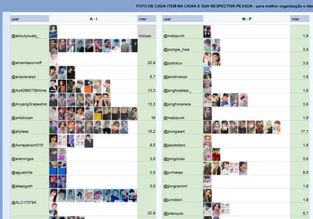 • Na minha planilha, tem a aba de "fotos" onde é organizado todos os participantes da caixa em ordem alfabética, e então organizado por foto todos os itens que a pessoa tem, seguido do valor do frete inter a ser pago do lado das fotos.<- foto ao lado de uma planilha antiga como exemplo