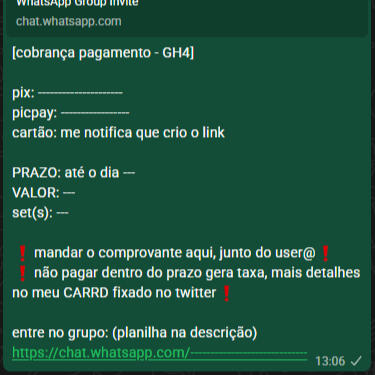 • Eu sempre mando uma mensagem na propria dm ou pv da pessoa avisando do pagamento, como no exemplo da foto ao lado!-> Na mensagem ao lado usada como exemplo, tem o nome da ceg, o prazo que você tem para pagar o item, o valor, e o mais importante: link da caixa! Caso você não entre no link da caixa, irá perder o prazo de frete inter, e se perder a responsabilidade de arcar com a taxa de atraso será sua!-> após o pagamento, a unica coisa que você deve fazer é esperar. Se for item de caixa normal, deve chegar em alguns dias na casa da proxy, e então eu posto no grupo a foto proof do set. Se for ceg de comeback, onde as pobs e lds geralmente DEMORAM pra saírem da loja, os itens DEMORAM, então é questão de: comprar e esperar.